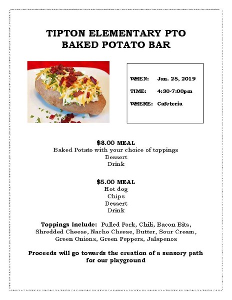 Tipton's PTO will be having a Baked Potato Bar Fundraiser on Friday, January 25, before the Courtwarming basketball game against Stover. Come support PTO for $8 from 4:30-7 pm in the cafeteria. This is a great way to get your bellies full and help the PTO continue to support our elementary school!