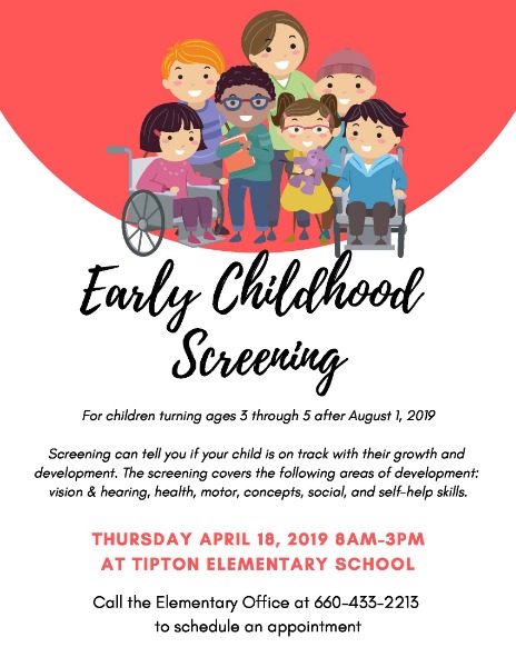 Early childhood screening will be April 18, 2019 for all children turning 3 through 5 after August 1 of 2019.