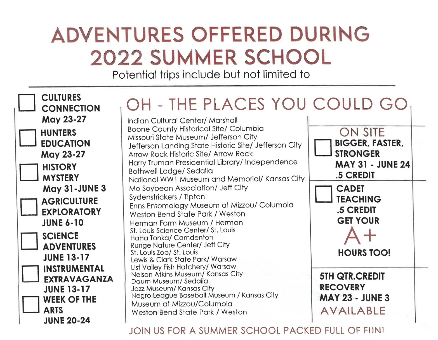 Get prepared for some summer school adventures with THS and TMS! This will be a fun summer full of trips and learning!